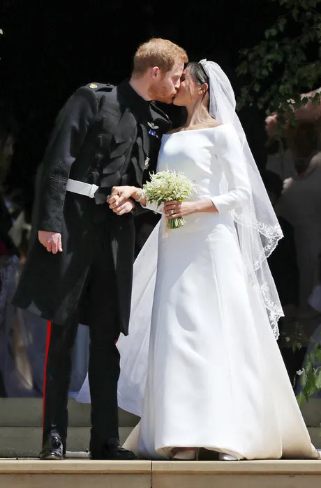 Открывает список звездных невест Меган Маркл. Лаконичное платье с вырезом, открывающим плечи, было дополнено роскошной вуалью длиной в шестнадцать футов, покрытой тончайшей вышивкой. Фата играла в церемонии и символическую роль — вышитые на ней цветы символизировали страны Британского содружества. Небольшой букет и узкая тиара подчеркивали хрупкость невесты.