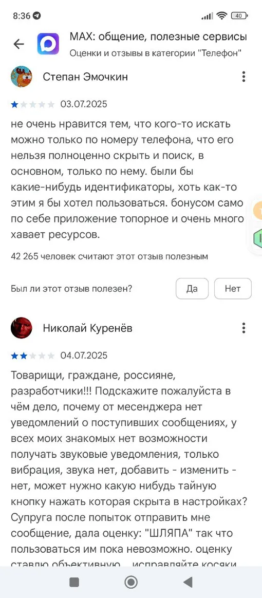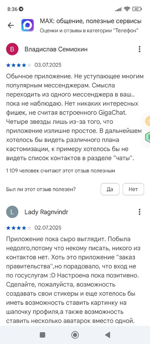 Мессенджер Max получает противоречивые отзывы: одним пользователям он нравится, другие считают его откровенно «сырым». Сейчас его оценка в Google Play невысокая — 3.3, на RuStore чуть выше — 4.4.