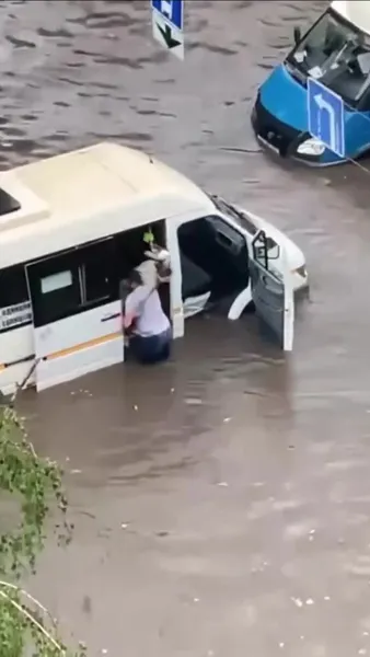 В такой непростой погодной ситуации нашлось и место подвигу — на видео попало, как водитель ушедшего в воду колёсами автобуса на руках переносит пассажиров до сухого места, находясь почти по пояс в этой самой воде.