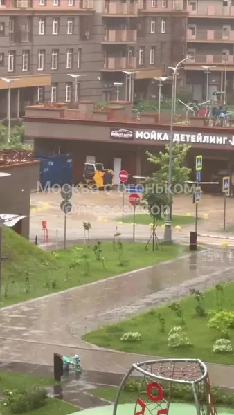 В московском районе Солнцево мощнейший ливень практически «стёр» фасад «Пятёрочки».