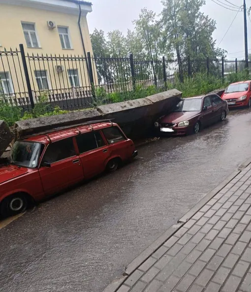 А вот владельцам автомобилей в Балашихе повезло меньше — на припаркованные машины рухнул бетонный забор — видимо, «размок».