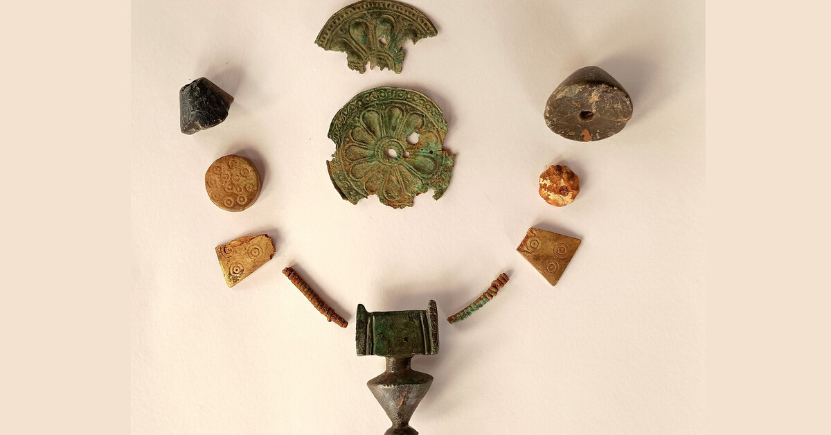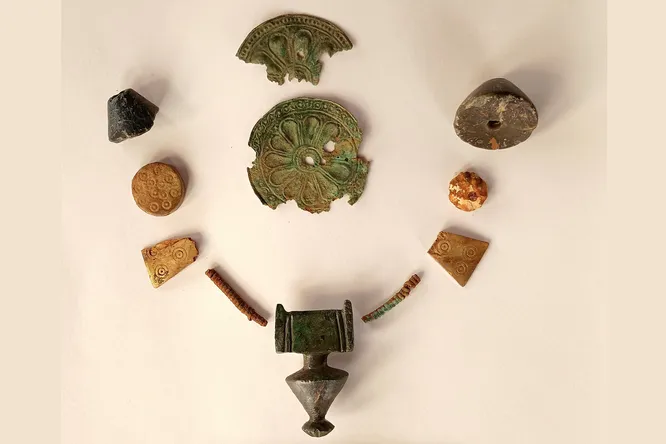 Среди найденных в захоронении подношений выделяются две крупные пряжки с гравированным геометрическим орнаментом в виде лошадей, ожерелье, бусины из слоновой и другой кости, янтарные кулончики, пластинчатые розетки, медные серьги, пселлия (браслет) и спиральные кольца, которые женщина носила на всех фалангах пальцев.