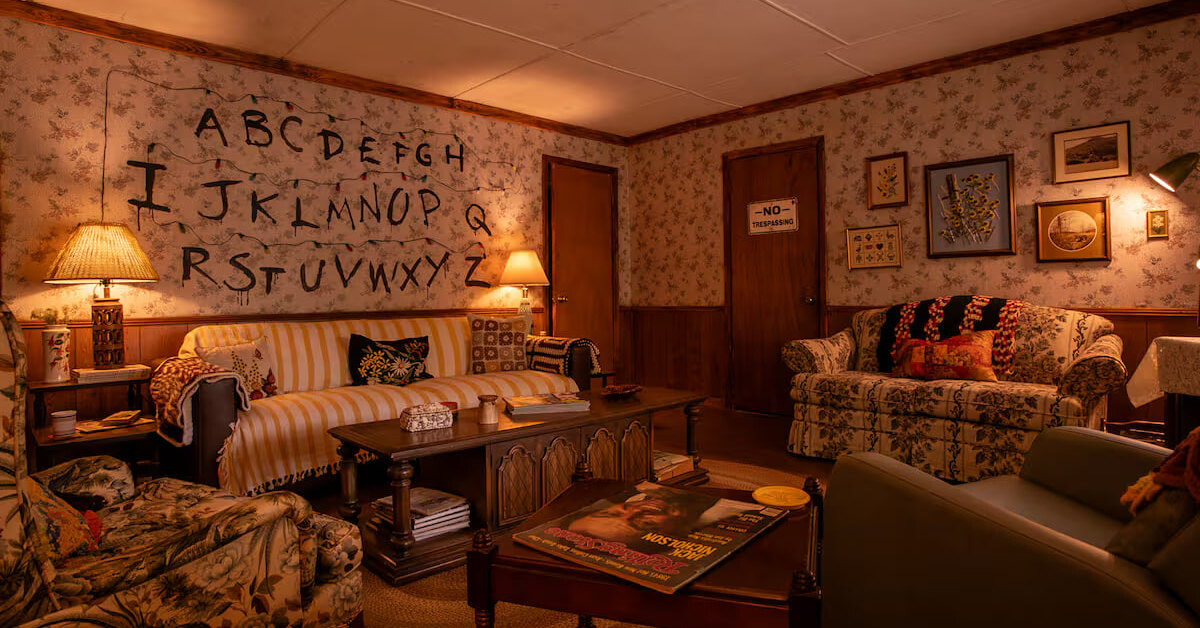 «Это не просто дом, который выглядит как дом Байерсов — это фактический экстерьер, использованный в сериале, с деталями, вдохновлёнными интерьерными декорациями», — сообщается в описании на Airbnb. В интерьере присутствуют десятки пасхальных яиц и отсылок к сериалу: культовая стена с рождественскими огнями, виниловая коллекция Джонатана, велосипеды BMX, настольные игры, двухъярусная перевернутая комната и старый ЭЛТ-телевизор для просмотра VHS-фильмов. Для современных гостей предусмотрен и телевизор Samsung Frame.