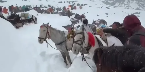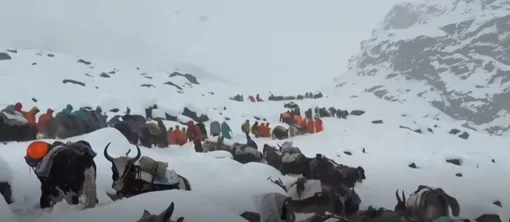 После аномально сильного снегопада с метелью на тибетских склонах Эвереста — самой высокой горы в мире — оказались в ловушке сотни альпинистов. Для спасения людей были снаряжены сотни местных жителей и спасателей, чтобы расчистить снег. Один из местных жителей снял видео, на котором видно, как длинная вереница людей с лошадьми и волами поднимается по заснеженное извилистой тропе, пишет Apnews.com.
