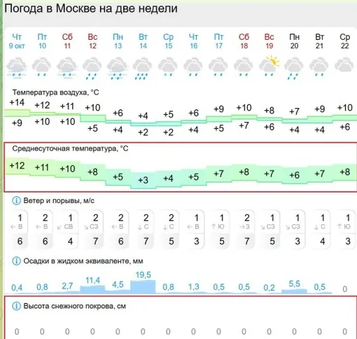 И если сегодня температура на шесть градусов теплее климатической нормы, то уже начиная с завтрашнего дня погода начнёт портиться, забарабанят дожди, ночью будет плюс 8−11, а днём 10−13. Ну и на выходных по ночам будет плюс 5−8, а после полудня — не выше плюс 7−10, что уже соответствует климатической норме октября. Однако это только начало похолодания, поскольку на следующей неделе в столице наступит глубокая осень.