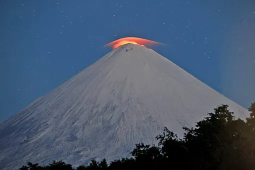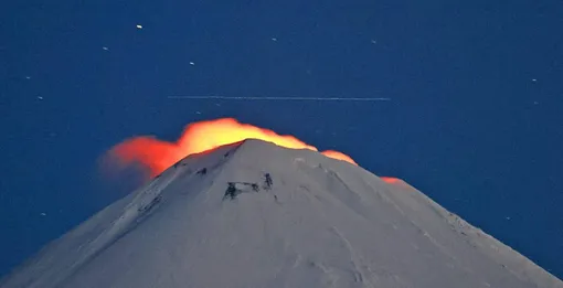 На кадрах видно, как вершина самого высокого действующего вулкана Евразии заполняется раскалённой лавой. Её свет отражается в парогазовом столбе, формируя так называемое лентикулярное облако — плотное, гладкое образование, по форме напоминающее гигантскую линзу или летающую тарелку. Такие облака встречаются крайне редко и образуются в горах при особом сочетании влажности, ветра и температуры.