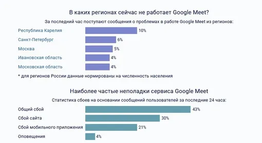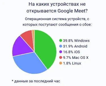 Наибольшее количество жалоб поступило от пользователей Республики Карелия — 10%, далее следует Санкт-Петербург с 6%, Москва с 5%, а также Ивановская (4%) и Московская области (4%). Больше всего проблем с работой Google Meet наблюдается на устройствах с операционной системой Windows (39.8%). На втором месте стоит Android с 31.9%, далее идёт iOS (16.8%), Mac OS X (9.7%), а замыкает топ Linux с 1.8%.