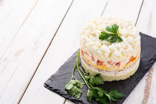 На втором месте по стоимости — салат «Мимоза», на приготовление которого уйдет 295 рублей. Для него потребуются рыбные консервы (250 г), картофель (350 г), пять яиц, морковь (250 г), лук (150 г) и майонез (150 г).