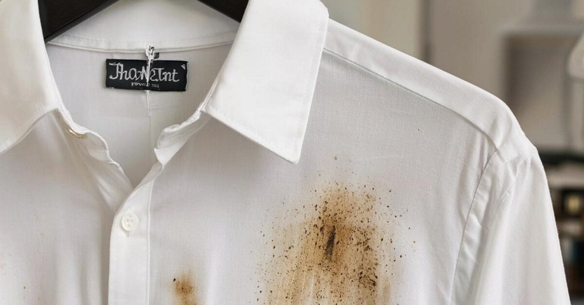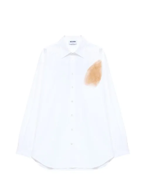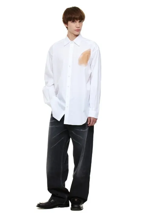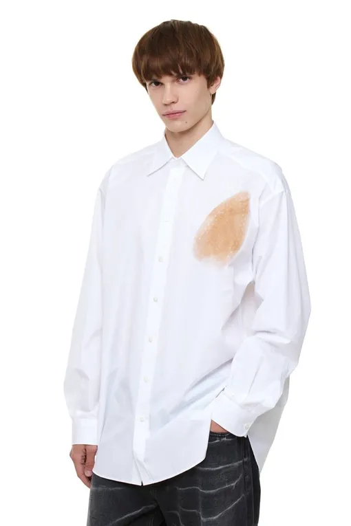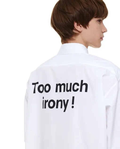 «Белая рубашка с длинными рукавами, классическим воротником и застежкой на пуговицы спереди. Украшена принтом в виде пятна от утюга спереди и ироничной надписью сзади», — гласит описание товара.