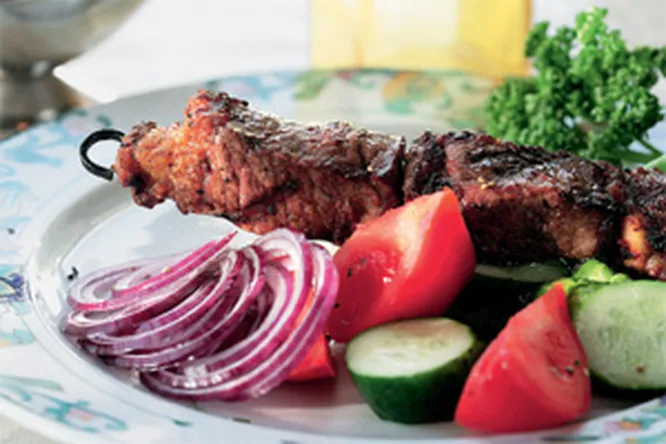 Нарежьте баранину крупными кубиками — так шашлык будет сочнее. Пропустите все ингредиенты для маринада через мясорубку, добавьте масло и замаринуйте мясо на 3−4 часа. Нанижите на шампуры и жарьте бараний шашлыкдо готовности.