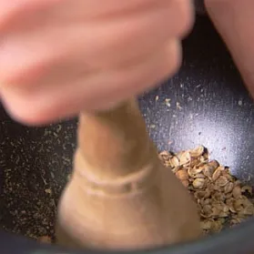 Специи также можно перемолоть — крупно или мелко, в зависимости от их дальнейшего использования. Для того, чтобы крупно перемолоть специи, добавьте их в миску с круглым дном и пройдитесь по ним деревянной толкушкой. Добиться мелкого помола вам поможет специальная мельница.
