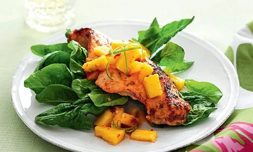 4. Подавайте, выложив стейки на листья шпината и гарнировав их кусочками ананаса. Полейте листья и стейки соусом.