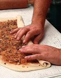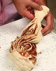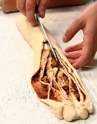 3. Cверните тесто в рулет и разрежьте посередине. Свейте жгут из двух половинок теста так, чтобы разрез оказался сверху.