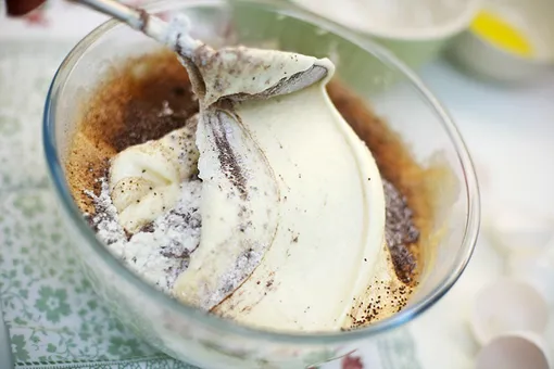 Размешайте ложкой от края к середине, опуская тесто в центр миски.