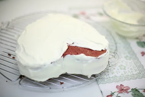 Белоснежный торт, а на разрезе — красный бархатный бисквит. Неожиданно и очень подходяще для романтического ужина. Этот торт американский, я в американских бисквитах не сильна, поэтому долго думала над рецептом. Большинство встреченных мною — с содой, большим количеством масла и парой яиц, с кремом из сливочного сыра. Но, по моему скромному мнению, десерт должен быть легким, так что пришлось изобретать велосипед — за основу я взяла легкий шоколадный бисквит, а для крема — просто взбила сливки. Снаружи торт можно посыпать кокосовой стружкой или, как я, тертым белым шоколадом.