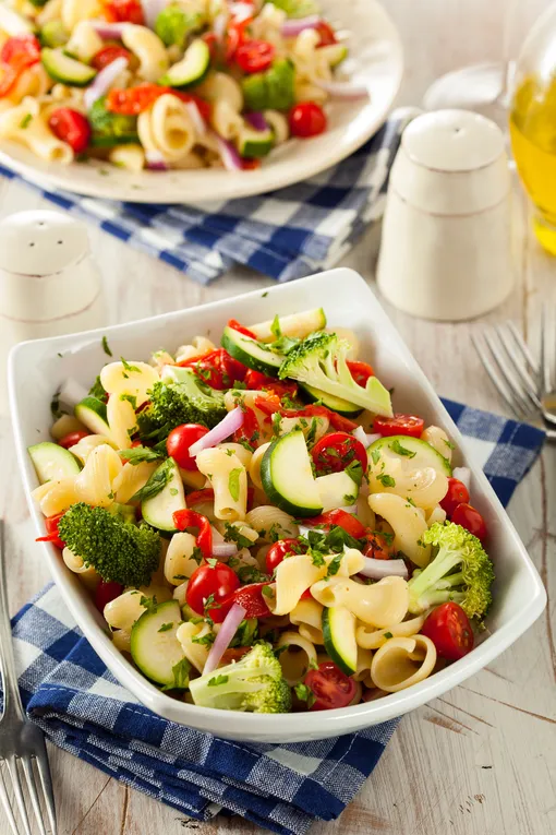 Приготовьте брокколи на пару и отварите макароны. В миску для салата положите помидоры черри, кукурузу, огурец (его нужно нарезать) и брокколи. В стакан для блендера выложите йогурт, морковь, огурец, чеснок, масло, уксус и соль, пюрируйте. Смешайте салат с соусом и подавайте на стол.