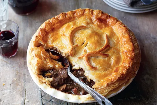 Это настоящее старое и заслуженное английское блюдо — очень вкусное и душевное. Сначала мясо тушится с овощами, специями и с добавлением вина, а затем его перекладывают в форму для запекания и накрывают крышечкой из слоеного теста. Готовый Мясной пирог ставят на центр стола, чтобы каждый гость накладывал себе самостоятельно. Пирог получается таким сытным, что к нему можно подать приготовленные на пару овощи.
