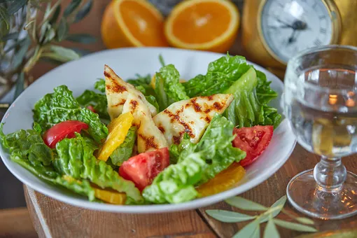 Марули Мэ Халуми (зеленый салат латук с апельсином и томатами)