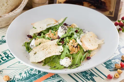 Салат из свежей зелени с козьим сыром, ароматным тархуном и вяленой клюквой