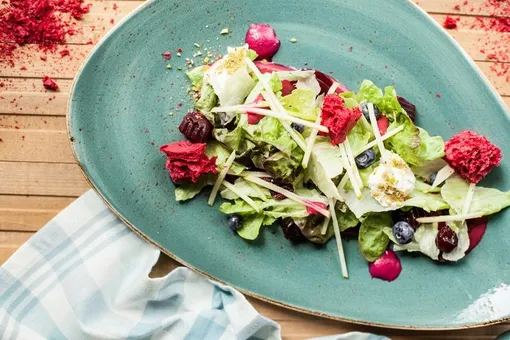 Для салата необходимо заранее приготовить два вида свеклы. Для этого 50 г свеклы отварить с добавлением соли и сахара, оставшиеся 30 г запечь в духовом шкафу. Приготовить микс из салатов Айсберга, Фриллиса и радичио. Сделать свекольный соус: отварную свеклу (20 г) нарезать кусочками и прогреть в микроволновой печи. Затем пробить в миксере до консистенции пюре, добавить соль, сахар, мускатный орех, оливковое масло и снова пробить до однородности. На тарелку выложить соус, затем нарезанную отварную и запеченную свеклу. Далее выложить микс салатов, голубику, вишню. Нарезать соломкой яблоко, выложить сверху. Сбрызнуть оливковым маслом. Добавить кнели из мягкого козьего сыра.