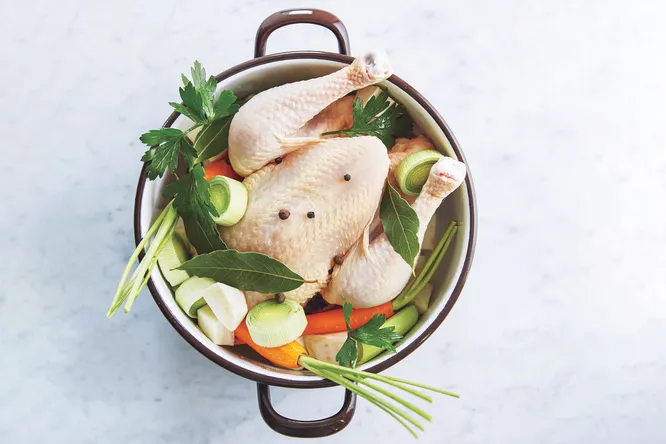 - Удалите овощи, переложите курицу в большую миску и посолите бульон. Отделите мясо от кожи и костей и оставьте для подачи с супом или используйте для другого рецепта.