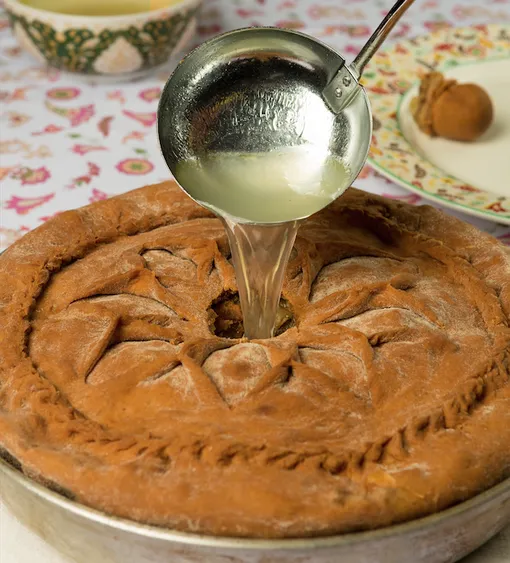 - Через 40-50 минут открываем «Тенлек» и вливаем внутрь немного бульона. Убавляем температуру до 120-130 градусов и доводим пирог до полной готовности.