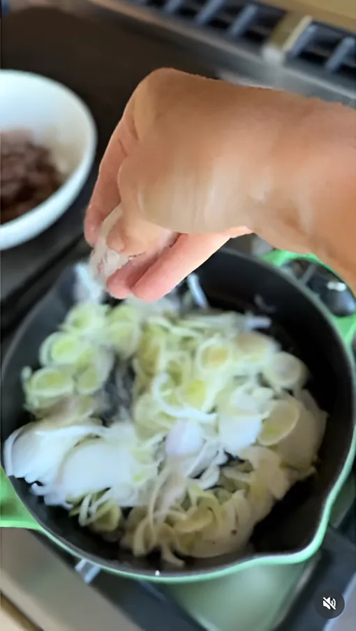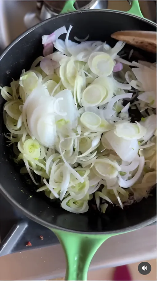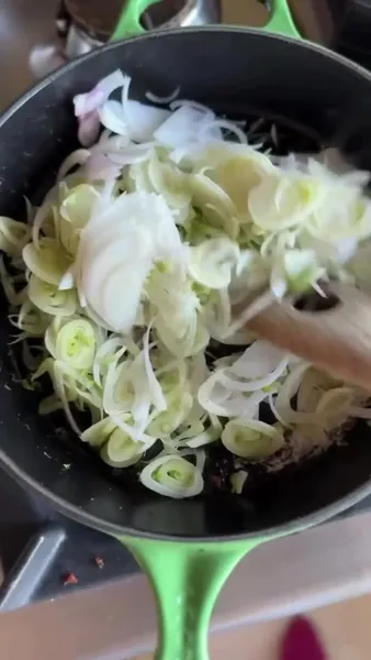 Шаг 1. Нарежьте лук-порей кольцами, а репчатый лук — полукольцами. Тушите овощи на медленном огне с небольшим добавлением растительного масла до появления золотистого цвета. Добавьте соль по вкусу.