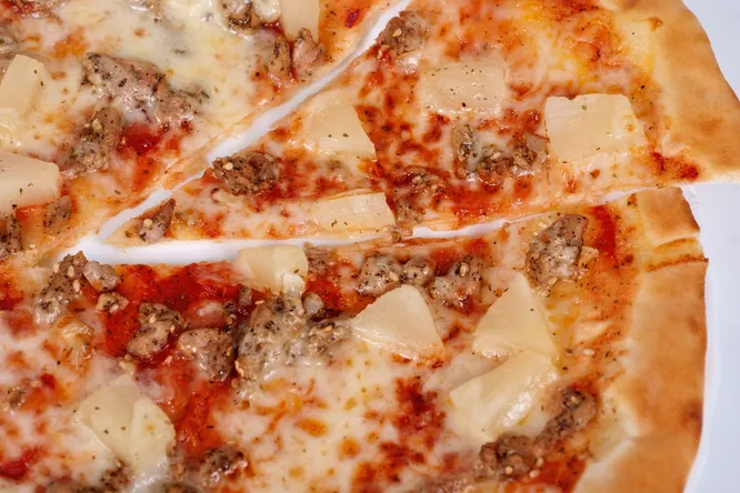Этот рецепт изобрели предприимчивые американцы, которые решили добавить в итальянскую классику нотки ананаса, бекона (или курицы) и моцареллы. Результат получился изумительным, компоненты прекрасно дополняют друг друга. Тесто для гавайской пиццы с ананасами тоже существенно отличается от итальянского и получается гораздо более пышным.