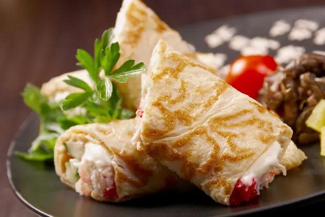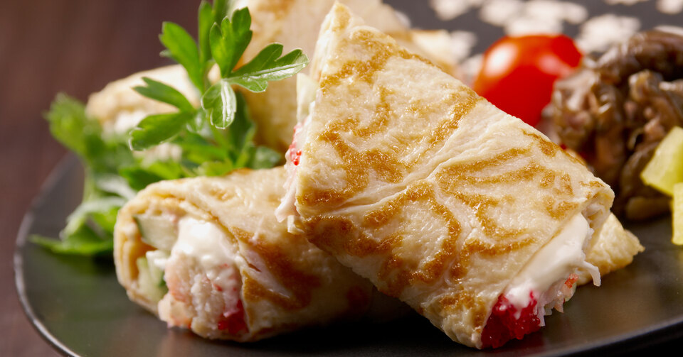 Менее привычный, но не менее вкусный вариант — приготовить несладкие блинчики с творогом. Рецепт блинчиков можно взять классический (разумеется, без сахара), а вот для начинки смешать с творогом эти ингредиенты: