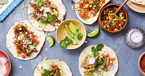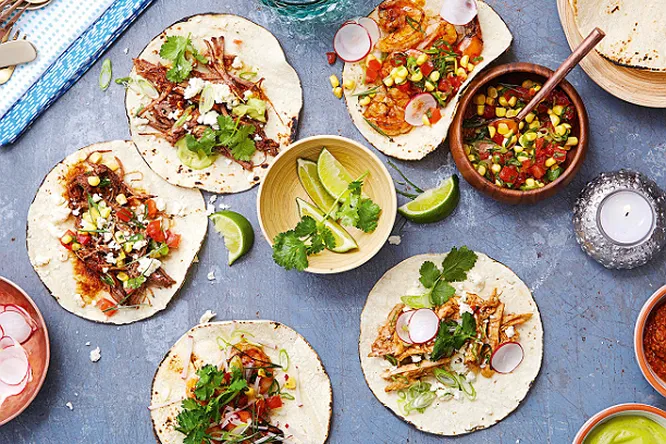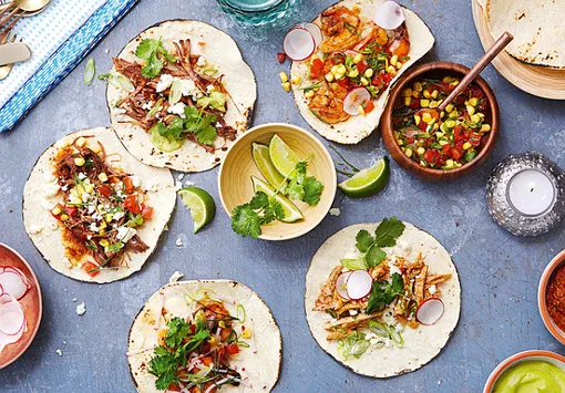 Тако – кукурузная или пшеничная лепешка с разнообразной начинкой (говядиной, свининой, курицей, морепродуктами, колбасками, овощами, приготовленными на гриле), подается с соусом и свежей зеленью. Берем лепешку или лаваш, наполняем начинкой, складываем вдвое и едим руками.