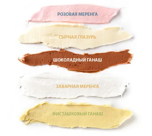 Взбейте сыр филадельфия с сахарной пудрой. По желанию подкрасьте любым красителем. Фисташковую пасту* можно заказать в интернет-магазине товаров для профессиональных кондитеров или приготовить дома. Для этого очищенные фисташки (желательно несоленые) залейте кипятком и оставьте на 5 минут. Слейте воду, слегка остудите и очистите орехи от кожицы. Подсушите орехи в духовке, разогретой до 100˚С, в течение 10−15 минут. Остудите, измельчите блендером с небольшим количеством растительного масла до гладкой массы.