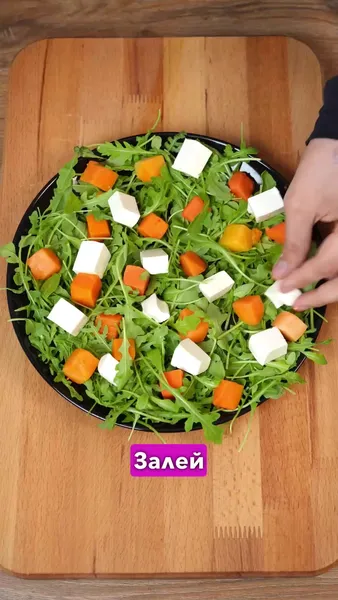 - Раскидайте поверх руколы вашу брынзу и запеченную тыкву, сверху полейте бальзамическим уксусом. Для дополнительного вкуса добавьте сверху семечки тыквы.