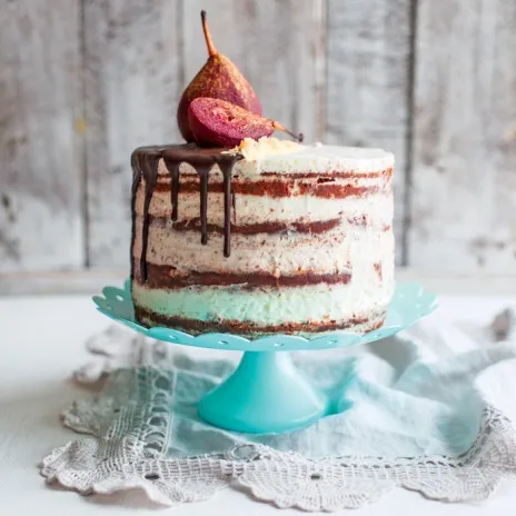 - Приготовьте глазурь: на водяной бане растопите шоколад с маслом, размешайте до однородности, немного остудите и вылейте на торт так, чтобы глазурь произвольно стекала по стенкам торта, сверху выложите груши в вине (см. подсказку на странице слева) и уберите торт в холодильник.