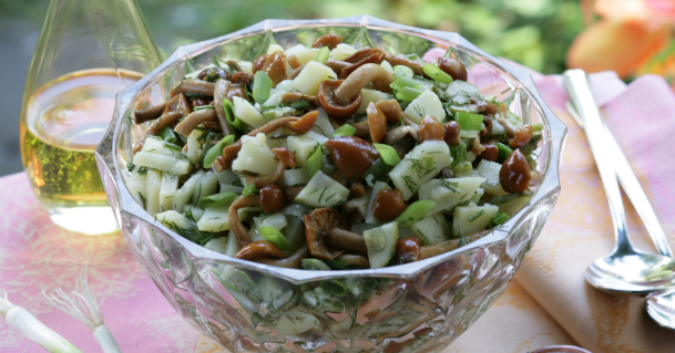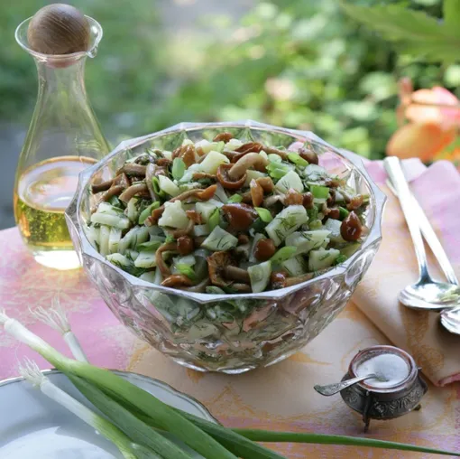 Отличный вариант для постного стола. Маленькая баночка маринованных опят сделает этот салат очень привлекательным на столе. Немного свежего укропа и огурчиков — и готово. В качестве заправки — ароматное подсолнечное масло и специи.