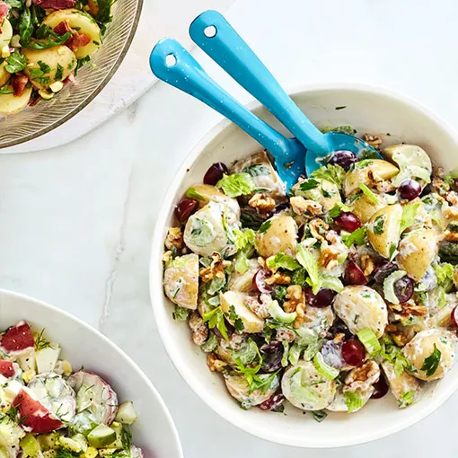 Пример сочетания самых разных вкусов и текстур в одном салате. Тут и отварная картошка, и хрустящий нарезанный стебель сельдерея, и половинки мягких сочных ягод винограда и свежая зелень. В качестве заправки — сметана, майонез и ложечка дижонской горчицы.