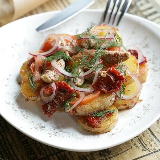 Этот пикантный салат лучше подавать теплым. Вяленые томаты в масле, каперсы и нонко нарезанный красный сладкий лук — прекрасное сочетание, попробуйте!