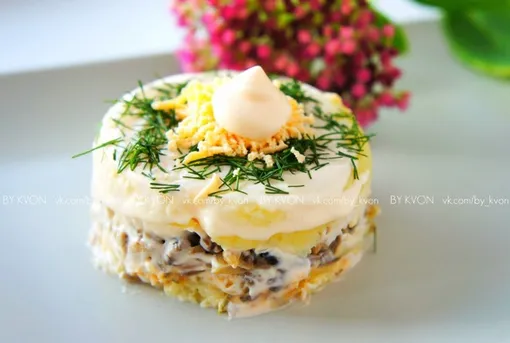 В любимые салаты из нашего детства — «Мимоза» и «Селедка под шубой» конечно же входит картофель. Мы любили из за то, что за время, проведенное в холодильнике все слои салата салата обменивались вкусами, пропитывались соусом и в результате вкус становился очень нежным. Слоеный картофельный салат «Дубок» из той же категории, берите рецепт на вооружение!