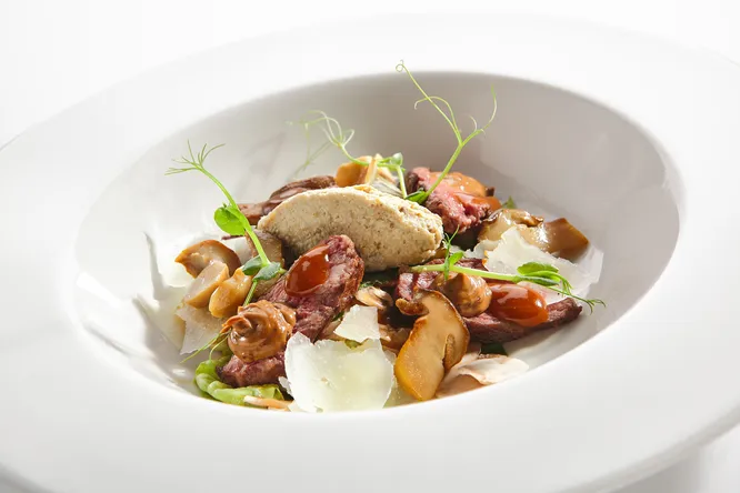 - Картофельный гратен: картофель нарезаем тонкими слайсами, отвариваем в молоке две минуты. Белые грибы нарезаем средним кубиком и обжариваем на оливковом масле. Картофель выкладываем в шесть слоев в следующей последовательности: картофель, бешамель, белые грибы, пармезан. Запекаем в духовке 15 минут при температуре 200 градусов. Охлаждаем. Из готового гратена аккуратно вырезаем нужную форму (круг, квадрат).
