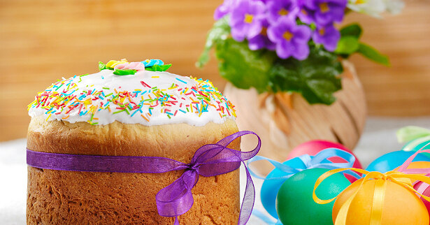 - Готовый заварной кулич накройте полотенцем, остудите и украсьте.