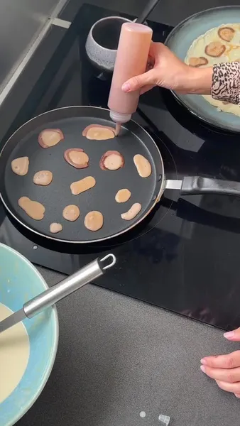 - Для выпекания выливать тесто на сковородку кружочками с помощью столовой ложки или бутылочек для соусов: сначала светло-коричневое тесто, формируя пятна, затем обвести светлые пятна полоской темного теста.