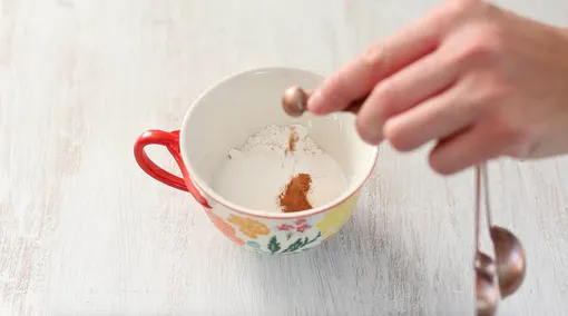 Добавьте муку, пекарский порошок, сахар, ванильный сахар, корицу и соль в чашку.