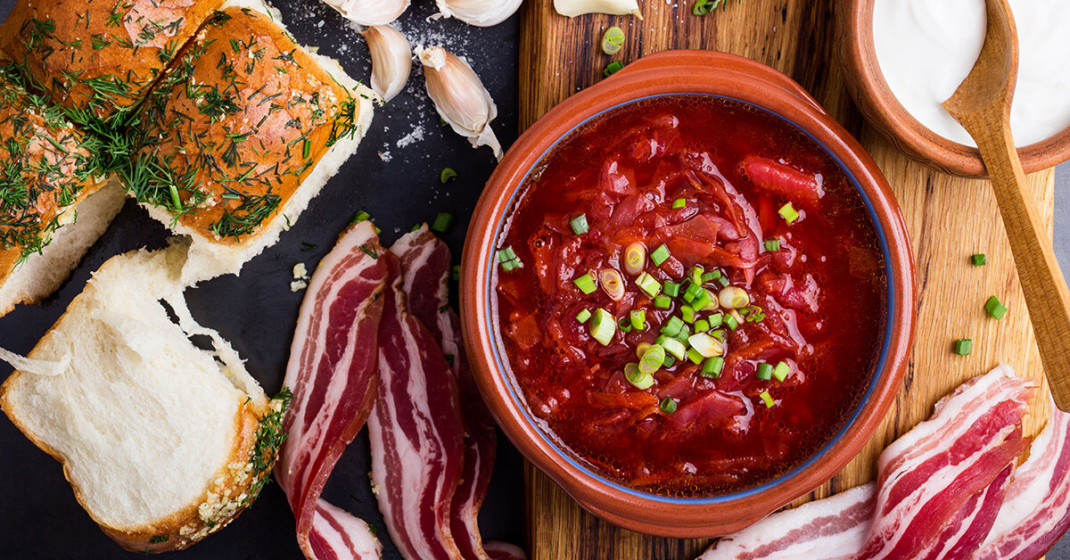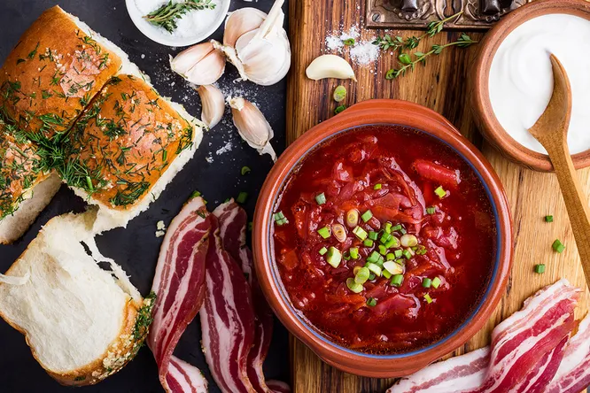 Подаем со сметаной, смальцем или салом, с чесночными пампушками.