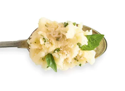 Мелко нарежьте листья двух веточек базилика, измельчите в прессе 1 зубчик чеснока, натрите ½ стакана сыра пармезан и смешайте с 4 стаканами картофельного пюре. На 4−6 порций. Загружаем