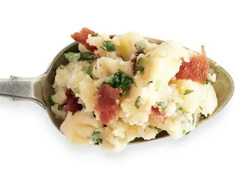 Обжарьте 3 полоски бекона, обсушите на салфетке и мелко нарежьте. Смешайте 4 стакана пюре с беконом, 1,5 ст. л. готового хрена и 1,5 ст. л. нарезанной зелени петрушки. На 4−6 порций.