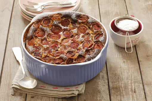 По сути Клафути — это разновидность запеканки. Французский летний пирог, который готовят часто с вишней или черешней. Но когда поспевают другие сезоныые ягоды, все идет в дело. Ягоды в этом пироге предпочтитльнее, чем фрукты, потому что они хорошо сохраняют сой внутри, не давая ему растекаться. Вишни в клафути французы кладут прямо с косточками, чтобы вкус получился более вишневым. Иногда даже не удаляют веточки и они мило торчат из теста. В наших просторах клафути конечно же можно готовить и с крыжовником и с малиной и с черникой. Отлично получается со сливами.