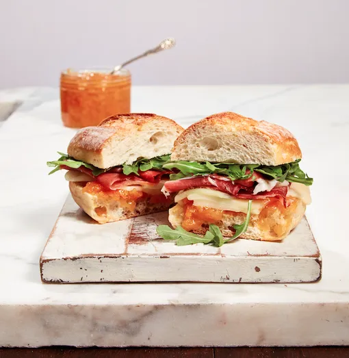 Сэндвич с беконом, сыром и джемом. Разрежьте чиабатту или небольшой багет поперек, смажьте половинки 2 ст. л. джема из дыни. Выложите на джем ломтики сыра (например, моцареллы), тонкие кусочки сыро- копченой ветчины или колбасы, добавьте горсть рукколы.