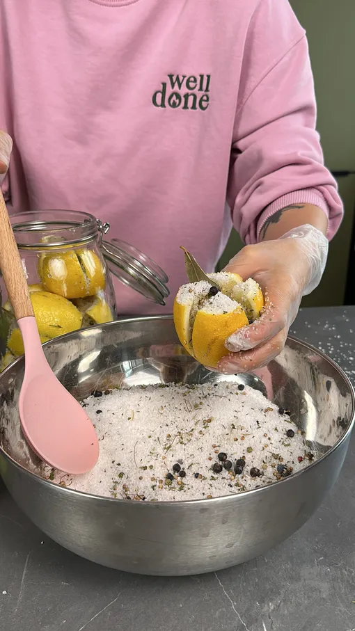 Сложить лимоны в банку, засыпать морской солью, плотно закрыть и поставить в тёмное и прохладное место.
