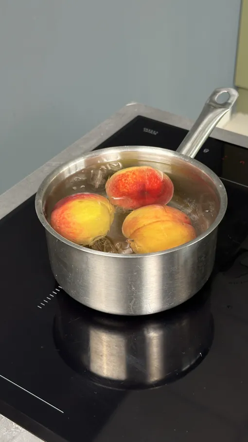Чтобы легко снять кожуру с персика, его надо бланшировать — бросить в кипящую воду на 40 секунд, затем окунуть в ледяную и дать там остыть пару минут.