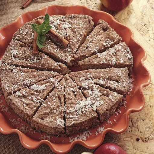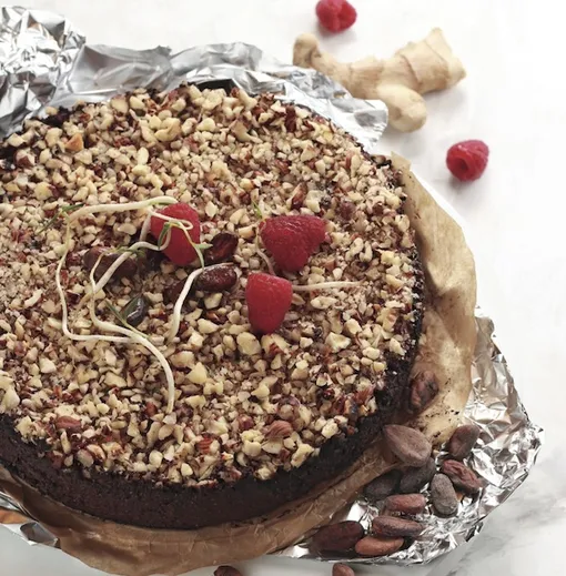 Грецкие орехи и миндаль замочить водой комнатной температуры на ночь. Утром воду слить и блндировать орехи с очищенными от косточек финиками и корицей. Сформировать корж.