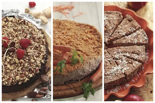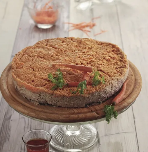 Для начинки очищенную морковь поделитьна 2 части. Одну часть натереть на мелуой терке, вторую часть блендировать с кешью, медом, специями и соком лимона. Выложить на корж, разровнять и охладить. При подаче украсить свежей тертой морковью.
